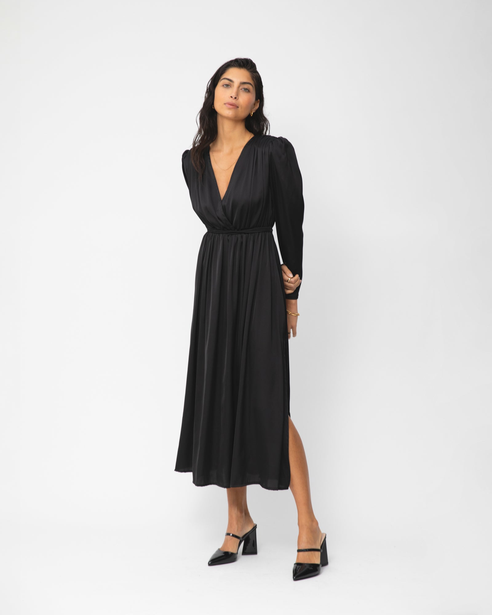 The statement dress you've been looking for is here - Dione Dress has been added to our Signature pieces collection. Soft satin fabric with oversized shoulders giving a dramatic look while side slit and deep cleavage give a feminine and sexy vibe.