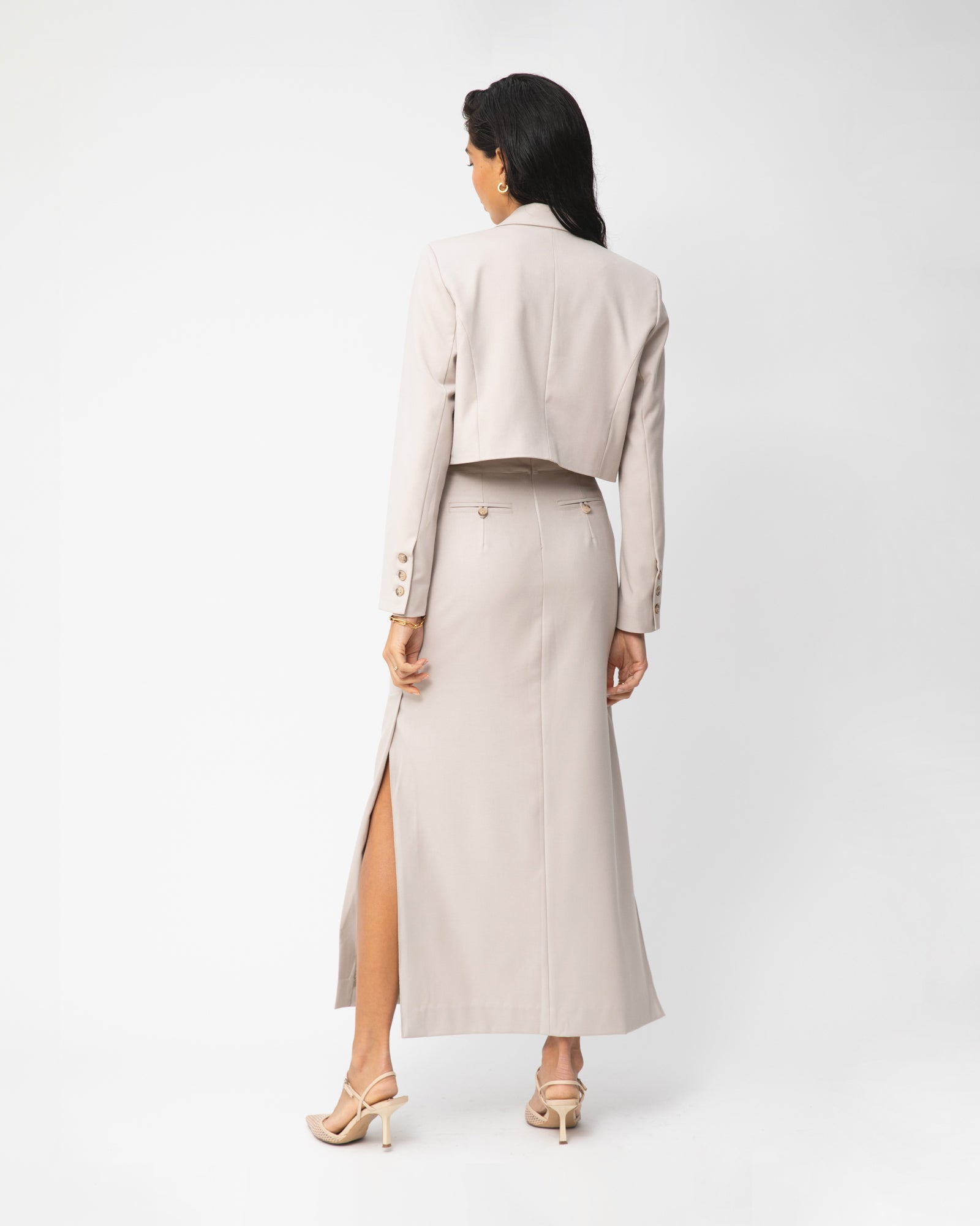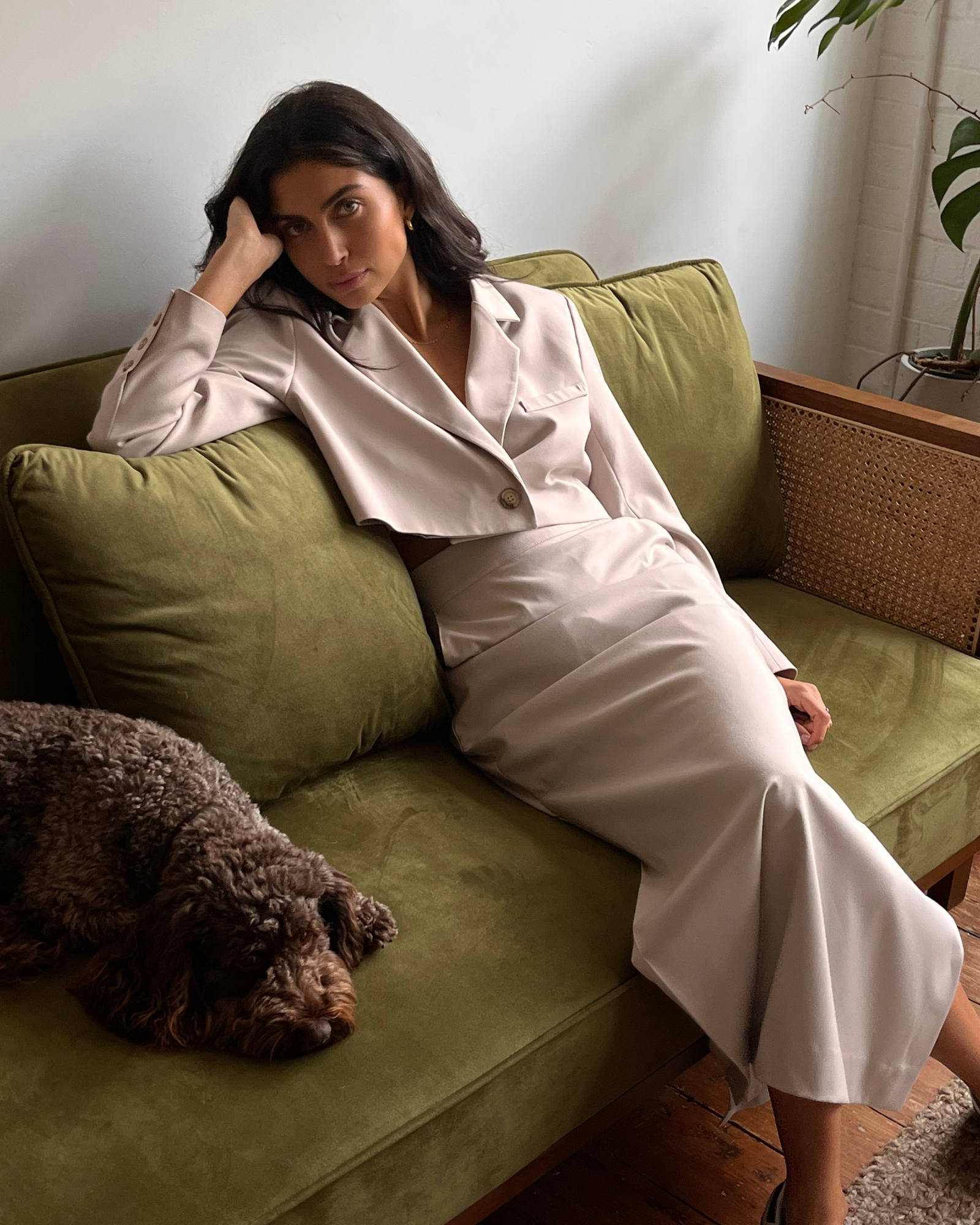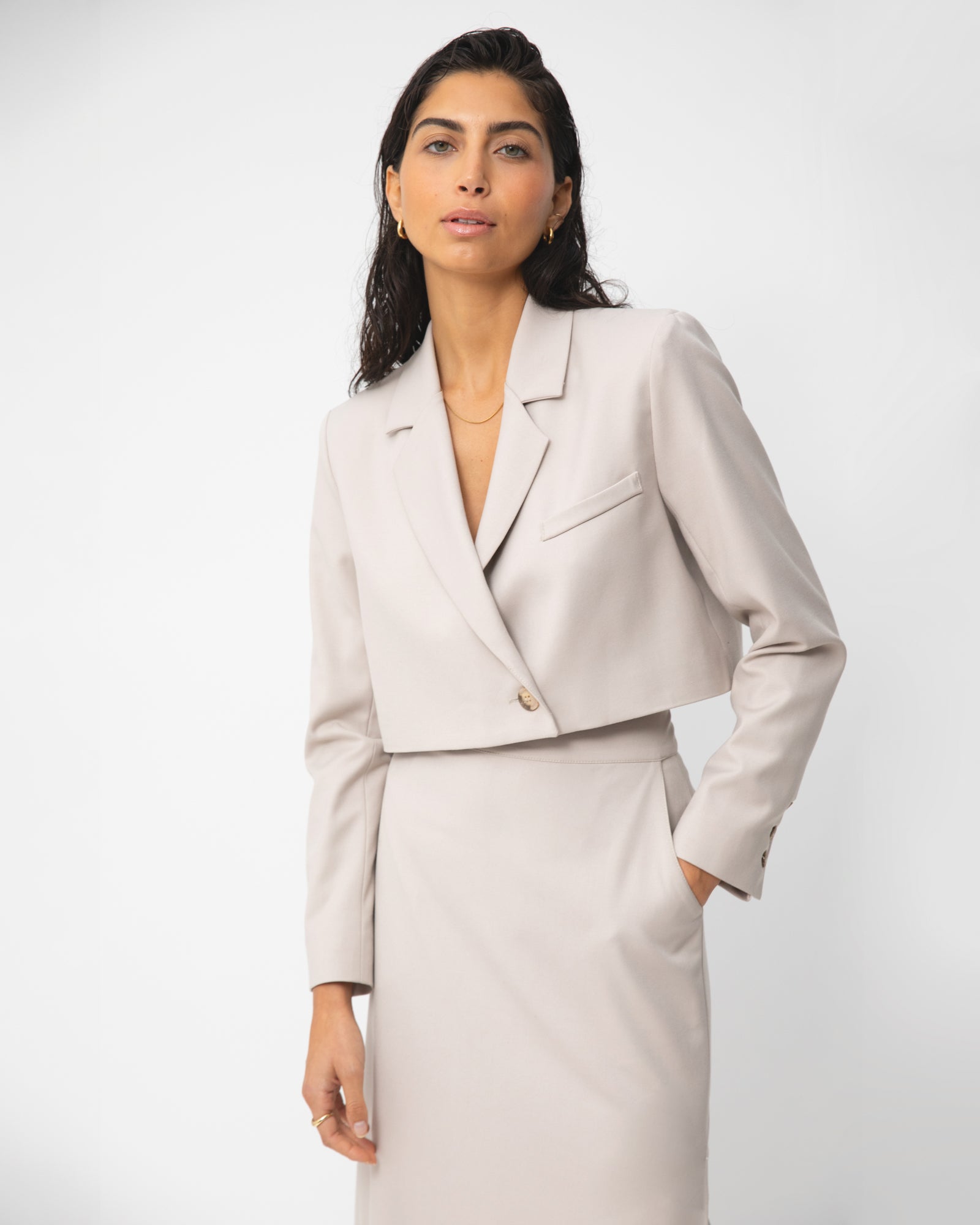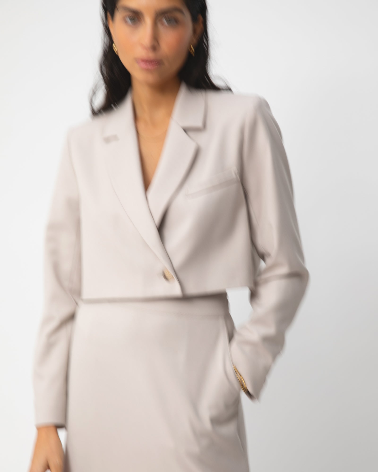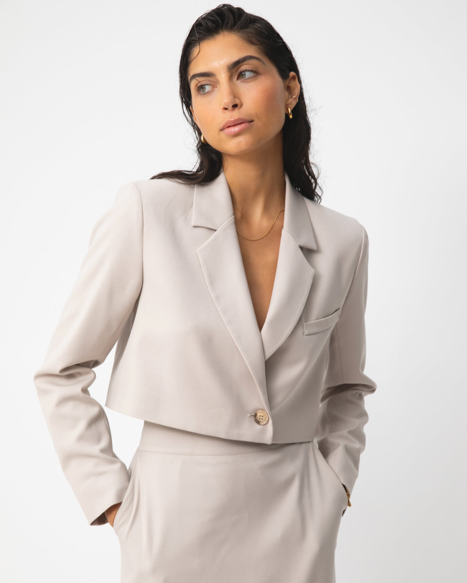 Shirley is tailored with polished, minimalist lines with a slim fit and cropped hem. The exaggerated, structured shoulders help create a boxy shape.